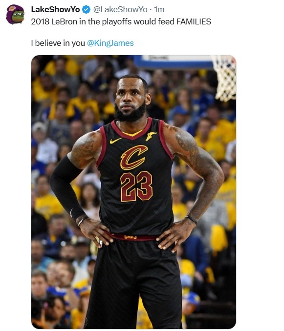 这样以来,里夫斯和东契奇可能在季后赛首轮都难以回归。湖人自媒体LakeShowYo晒出骑士詹的照片,并写道:“2018年季后赛里的勒布朗,足以扛起整支球队!我信你。”